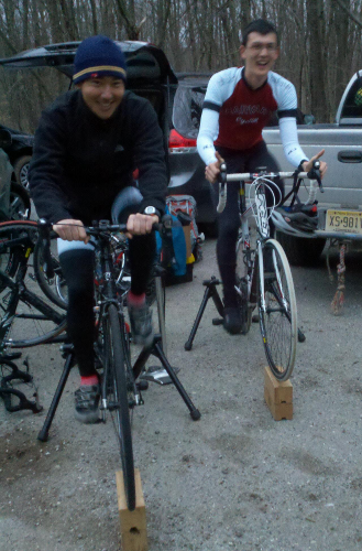 Ian and Joel warm up for a hill-climb time trial.